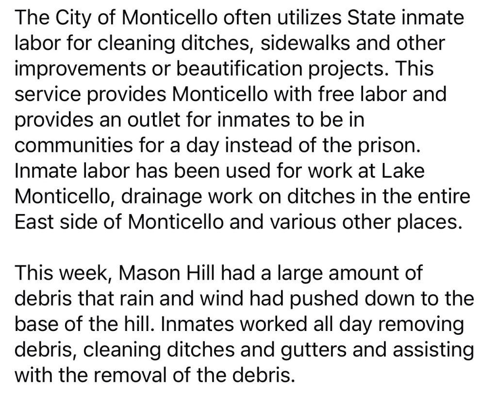 On Monday, March 23, 2026 from 9am until 1 pm the City of Monticello will be repairing the large drainage culvert located on Mason Hill near the intersection of Mason Hill and East Willis Street. The closing is expected to last from 9am until 1pm.