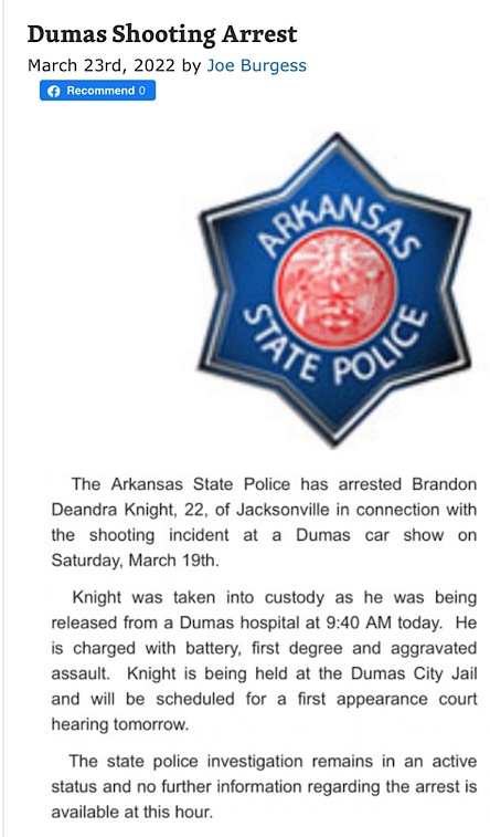 March 24th, 2022 byAt 3 PM, Wednesday afternoon at the Dumas Municipal Court, for the Dumas Shooting Suspect, Brandon Knight, a 22-year-old Jacksonville man.