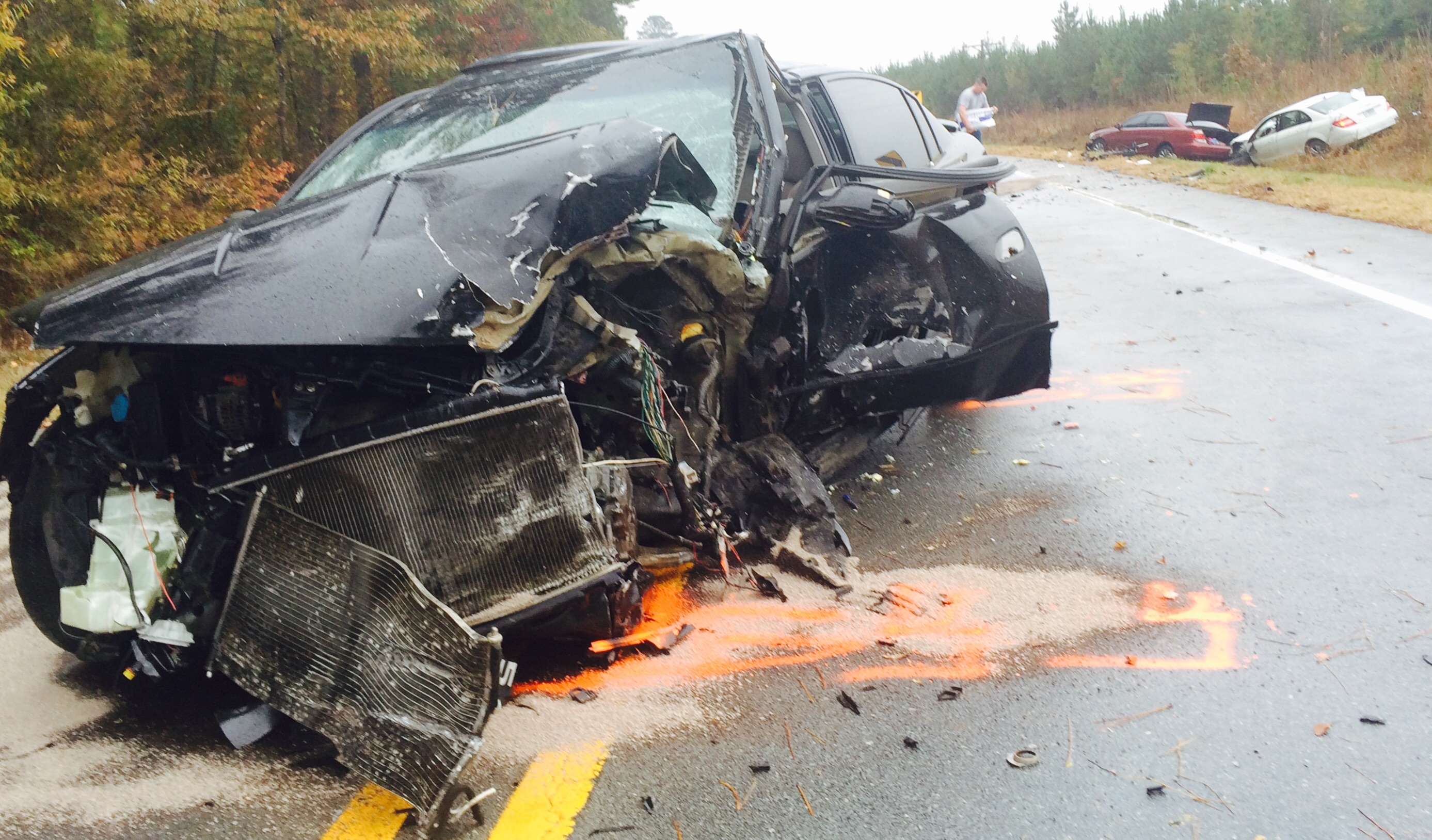 Sources on the scene report that a westbound black Nissan Altima crossed the centerline, colliding with a eastbound white Mercedes-Benz sedan.