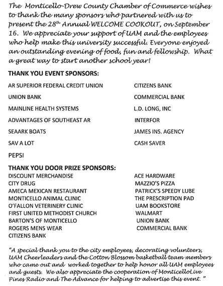 Posted in Announcements, Chamber of Commerce, UAM News | Comments Off on Weevil Welcome Cookout, Tonight, Monday, September 16th