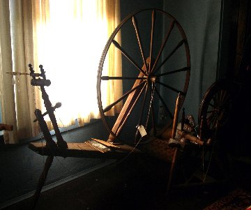 Last week we featured the loom, this week the spinning wheels. We have the one large and a smaller spinning wheel in the upstairs bedroom of the museum. The larger one still has some twine and cotton fibers on the spindle and are a light brown in color either from age or dyeing.