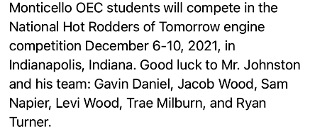 Posted in Business, Monticello School News | Comments Off on Local OEC Students Competing in National Hot Rodders of Tomorrow Competition, in Indianapolis, IN