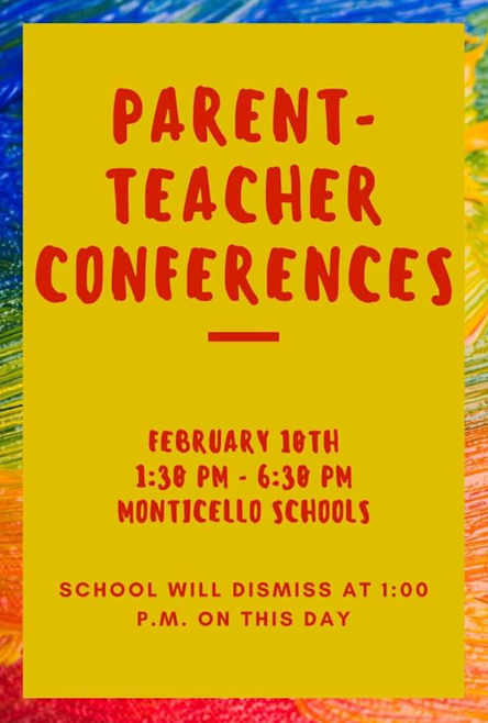 Posted in Monticello School News | Comments Off on PARENT- TEACHER CONFERENCES, FEBRUARY 10TH 1:30-6:30 PM, MONTICELLO SCHOOLS