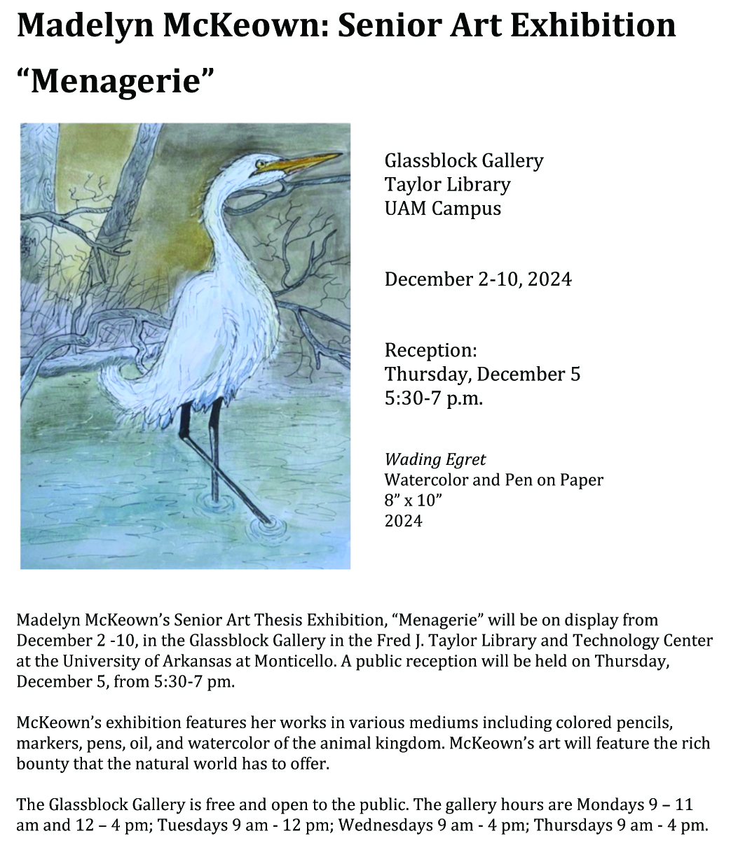 Alexia Lams, a graduate student in the Master of Education degree program at the University of Arkansas at Monticello (UAM), was recently honored with the 2024 Higher Education Art Student of the Year award by the Arkansas Art Educators (AAE) organization. She received the award at the AAE Fall Professional Development Conference on November 6 at the Arkansas Museum of Fine Arts in Little Rock, Arkansas.