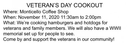 Posted in Veterans | Comments Off on Veterans Day Cookout at Monticello Coffee Co.