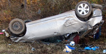 As he came around a curve, he swerved to avoid hitting a squirrel in the road, causing him to lose control of his Toyota Camry, which rolled and flipped across the ditch, striking the line of trees, and coming to rest upside down in the ditch.