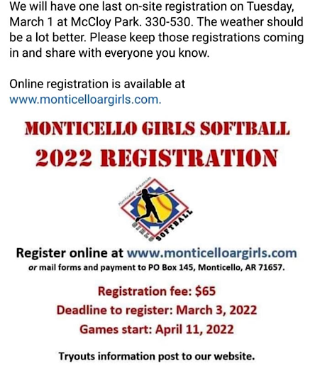 MONTICELLO GIRIS SOFTBALI REGISTRATION at McCloy Park, Tuesday