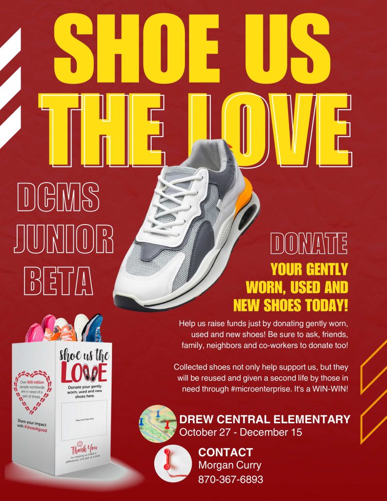 The Drew Central Middle School Junior Beta Club is excited to announce the launch of its Shoe Drive Fundraiser to raise money for the upcoming Arkansas State Beta Convention.Beginning October 27, the club will be collecting donations of gently worn, used, and new shoes. In return, the club will earn funds based on the total weight of the shoes collected, as Funds2Orgs will issue a check for the donated pairs.Anyone can participate by donating shoes at Drew Central Middle School or Drew Central Elementary School.All donated shoes will be redistributed through the Funds2Orgs network of micro-enterprise partners. Funds2Orgs works with micro-entrepreneurs in developing countries, helping them create and grow small businesses where economic opportunities are limited. Proceeds from shoe sales help families afford necessities such as food, clothing, and housing. One entrepreneur in Haiti even earned enough to send her son to law school.Shoes can be dropped off at Drew Central Middle or Elementary Offices.