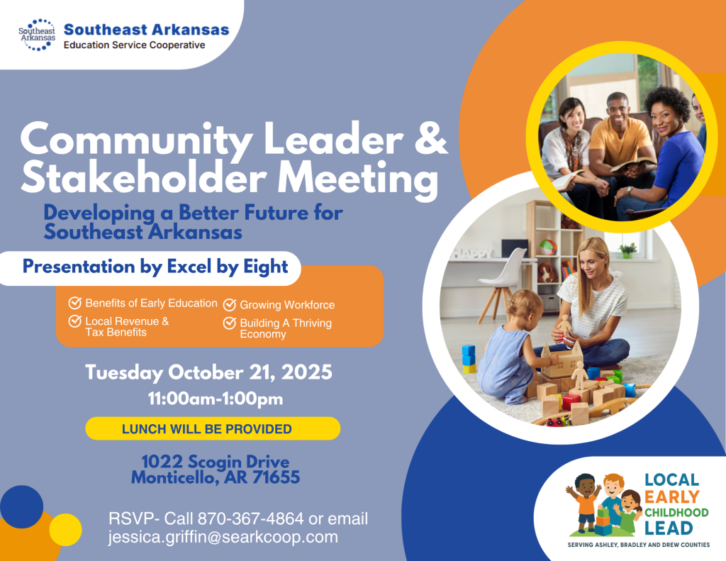 You’re invited to an important meeting to help Develop a Better Future for Southeast Arkansas. Your unique perspective and input are vital as we discuss important topics like the Benefits of Early Education, a Growing Workforce, Local Revenue & Tax Benefits, and Building a Thriving Economy.