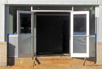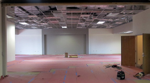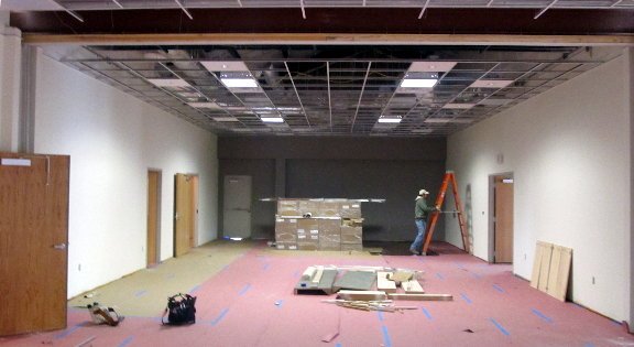 The east end of the building houses the smaller of the two meeting rooms. The photo also shows the air ducts, and wiring, which will be covered by the ceiling tile.
