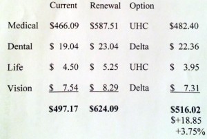 Renewal price from QualChoice, with life and dental, was $624.09. United Healthcare’s bid of $516.02, including life and dental, was described as “most reasonable” with its 3.75 rate increase over the 2013 rate.