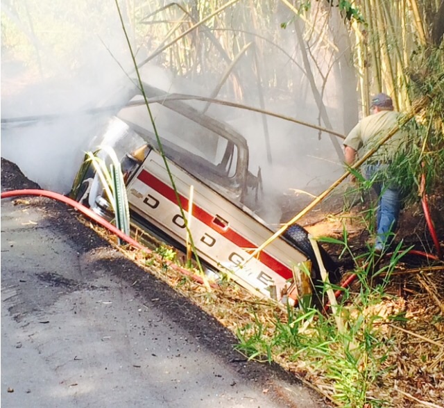 It is not known whether the truck ran in the ditch, then caught fire; or caught fire, before running into the ditch.