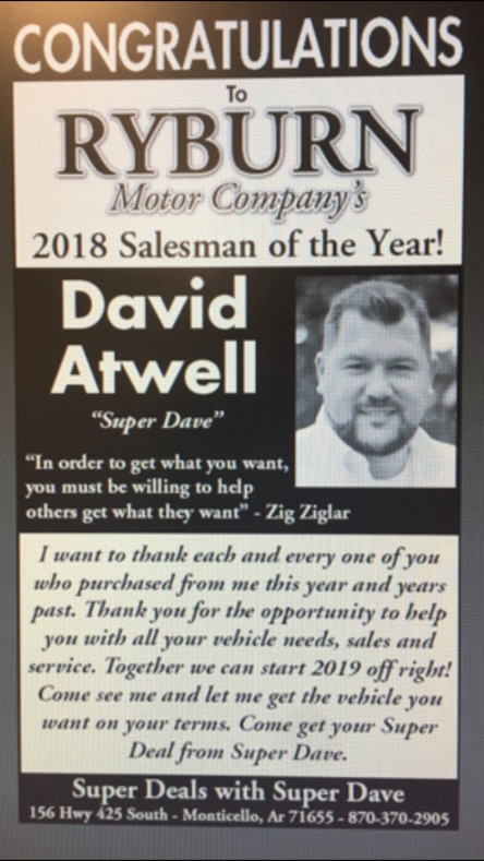 “Super Dave” Atwell salesman of the Year At Ryburn Motor Co.