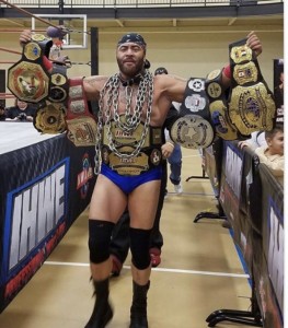 Since 2002 he has wrestled in the WWE and ECW, as well as several other wrestling organizations around the country, and is shown here, holding his 8 regional titles, from across the country.