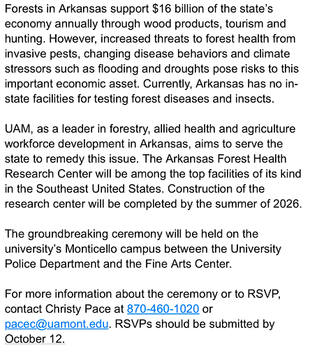 UAM to Hold Groundbreaking Ceremony for Arkansas Forest Health Research Center, October 17