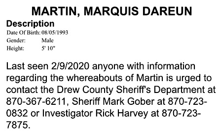 February 14th, 2020 byAt 9:30 this morning, at the Drew County Courthouse, Sheriff Mark Gober will meet with interested adults about being a part of a search party for Marquis Martin, who has been missing since Sunday at 10 PM. Adults only, please. Wear appropriate clothing.